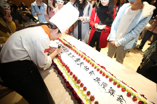 國(guó)際舞協(xié)現(xiàn)場(chǎng)教學(xué),氣氛非常濃烈。悠揚(yáng)的音樂,精致的面具,甜蜜的西點(diǎn)都為本次舞會(huì)增添了亮點(diǎn)。而我校西點(diǎn)大師的現(xiàn)場(chǎng)制作蛋糕環(huán)節(jié)也成了舞會(huì)的小高潮,老師們嫻熟地將蛋糕鋪上奶油,用水果裝飾,并在最后用巧克力醬寫上了“上海新東方.復(fù)旦素食協(xié)會(huì).浪漫舞會(huì)”的字樣預(yù)示著舞會(huì)的成功舉辦。