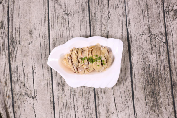 6. 取出煮好的三黃雞,放入調(diào)配好的湯汁中,充分浸泡
