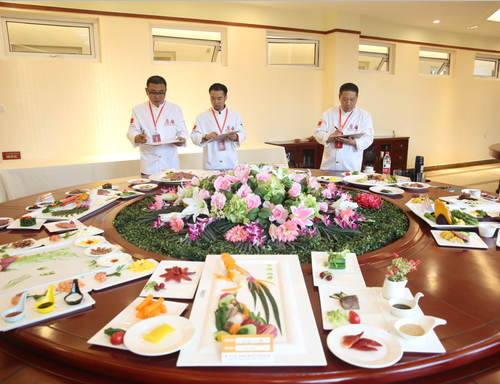 評(píng)委正在對(duì)宴席展臺(tái)進(jìn)行現(xiàn)場(chǎng)評(píng)分