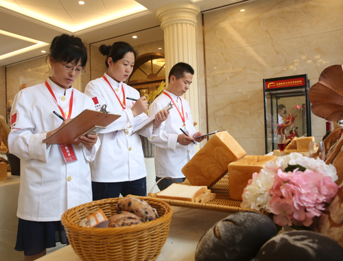 評(píng)委正在對(duì)面包烘焙組參賽作品進(jìn)行評(píng)分