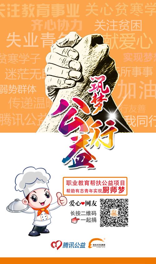 為助力失業(yè)待業(yè)青年、貧困少年實(shí)現(xiàn)夢(mèng)想,中國(guó)福利基金會(huì)聯(lián)合新華教育,以“新起點(diǎn)·筑夢(mèng)公益計(jì)劃”為主題,大力開展職業(yè)教育幫扶公益活動(dòng)!通過(guò)在新東方烹飪學(xué)校進(jìn)行烹飪技能培訓(xùn),并為其提供就業(yè)機(jī)會(huì),來(lái)幫助他們改變命運(yùn),幫扶大家實(shí)現(xiàn)自己的成才夢(mèng)。