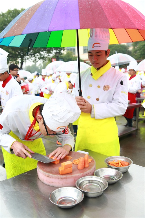 今天的刀工比賽的考評內(nèi)容是切胡蘿卜,包含把胡蘿卜切成頭發(fā)絲粗細(xì)和均勻大小的塊狀,隨著裁判員張成誠老師一聲令下,精彩絕倫的刀工比賽就此展開,參賽的中烹學(xué)員們個個眼神專注,讓平凡的食材以另一種形態(tài)展現(xiàn)在觀者眼前,讓這看似普通的比賽變成一場視覺盛宴。