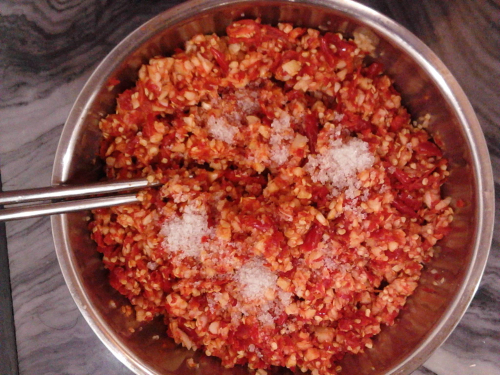三、將打碎的蒜和辣椒拌一下,然后撒鹽,鹽的份量也根據(jù)個(gè)人口味調(diào)整。