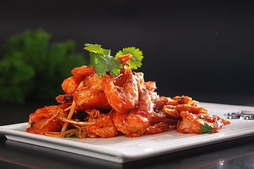 鍋內(nèi)留少量油,放入炸后的蝦段,澆入調(diào)味汁,收汁入味,裝盤成菜。