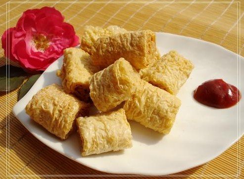 第二步將原料進(jìn)行腌制入味,并且使用豆腐皮或者網(wǎng)油將其卷包要嚴(yán)實,然后掛糊的要均勻。