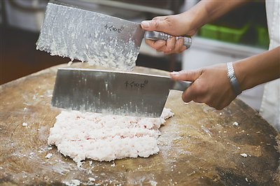 技術(shù)要求:操作時,用手腕帶動小臂上下擺動,揮刀將原料剁碎,同時勤翻原料,使其均勻細(xì)膩,抬刀不可過高,避免將原料甩出,造成不應(yīng)有的浪費。