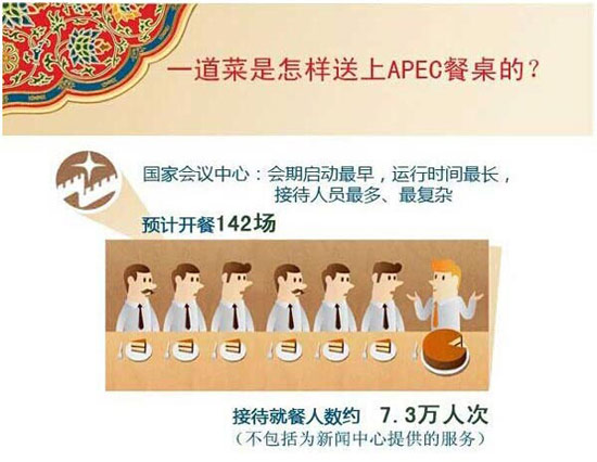 2014年11月10日,首都北京舉行亞太經(jīng)濟合作組織(APEC)會議,會議期間,與會者將吃到五洲風味,具有中國特色的驢打滾、叫花雞等列入菜單 。不重奢華和技巧,重品質、民族特色和文化傳播,已成為當今國際會議餐飲的潮流,APEC會議的餐飲也一樣。那究竟這次APEC會議餐桌上都會上些什么呢?