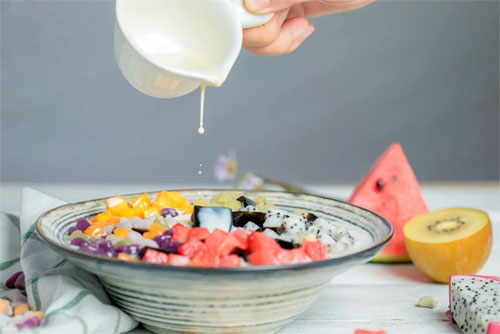 步驟三:將芒果、西瓜、奇異果、火龍果切塊放入碗中,加入仙草和芋圓,加入淡奶、牛奶和煉乳調味攪拌均勻即可。