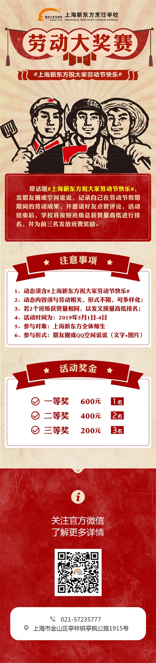 為考驗(yàn)同學(xué)們的班級(jí)凝聚力和勞動(dòng)執(zhí)行力,我校特開(kāi)展“勞動(dòng)大獎(jiǎng)賽”活動(dòng),活動(dòng)將以班級(jí)為單位,每位同學(xué)可通過(guò)發(fā)朋友圈或空間說(shuō)說(shuō)的形式,帶話(huà)題#上海新東方祝大家勞動(dòng)節(jié)快樂(lè)#,記錄自己在活動(dòng)期間的勞動(dòng)成果,并邀請(qǐng)好友點(diǎn)贊評(píng)論。