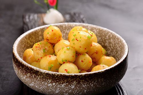 土豆中含多酚氧化酶,在氧氣的作用下會發(fā)生褐變,從而影響土豆色澤。因此在烹飪過程中,切好的土豆應(yīng)及時放在水里,以防氧化變黑。在浸泡時,可在水中加少許醋,一來可以有效地防止褐變,二來能讓土豆口感脆爽、不黏不糊,三來能減少土豆中維生素和礦物質(zhì)等的流失。需要提醒的是,土豆切完后最好馬上烹調(diào),以防營養(yǎng)素流失到水中。