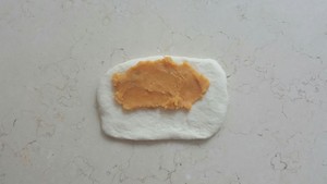 步驟六:將面團(tuán)正面在上按扁,搟面杖從中間向上向下?lián){開(kāi)成橢圓形,翻面,轉(zhuǎn)90℃ 橫放,稍整成長(zhǎng)方形,面團(tuán)上部碼適量甘薯餡,兩側(cè)不要放。