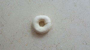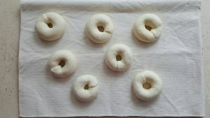 步驟十:發(fā)酵至近兩倍大,將發(fā)酵好的貝果,底面在上放入到90℃的煮貝果糖水中煮30-40秒,翻面 正面在上,繼續(xù)煮30-40秒,撈出放在吸水毛巾上稍吸干水后,把貝果放在烤盤上。