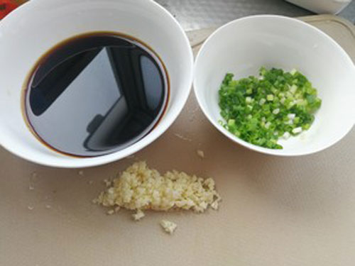 步驟一:將蔥、蒜切成末,蒸魚豉油兌水2:1。