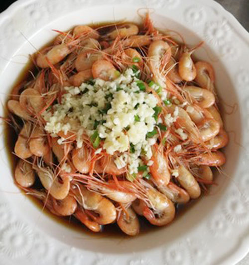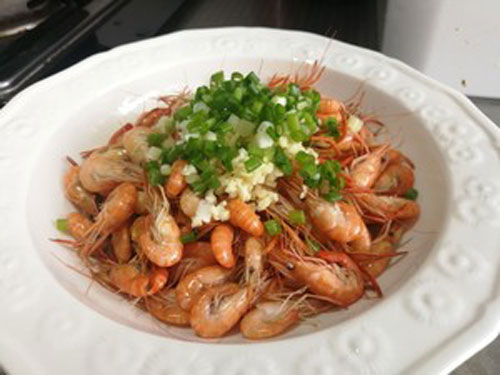 步驟四:將煮好的蝦放入盤中,蔥、蒜末放頂部。
