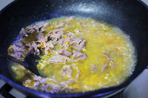 步驟五:鍋中倒入足量的水,料酒、陳醋、鹽、胡椒粉調勻煮開,接著放入焯好的肥牛煮1分鐘。