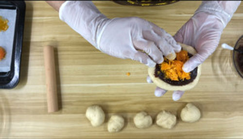 步驟四:發(fā)酵后排氣,分成6份,醒15分鐘,醒發(fā)好的面團(tuán)搟成圓形,翻面,豆沙按扁鋪在面團(tuán)上,再把碾碎的鴨蛋黃放入,慢慢收緊收口包好。