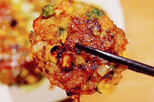步驟二:將食材和調(diào)料全部拌勻,做成小圓球,不粘鍋小火加熱,放入蝦餅,蓋鍋蓋兩面煎熟,五分鐘即可。