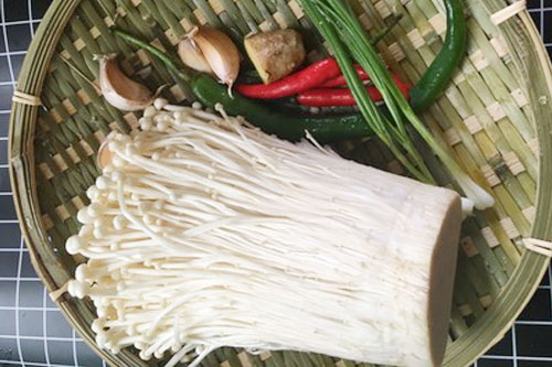 步驟一:準(zhǔn)備金針菇,小蔥3根,小米辣3個(gè),大蒜3瓣,青辣椒1個(gè),生姜1小塊。