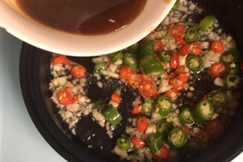 步驟五:蒜末辣椒生姜放進(jìn)熱油里爆香,倒進(jìn)料汁,慢慢攪拌,撒入一點(diǎn)小蔥末,湯汁濃稠了即可淋在金針菇上即可。