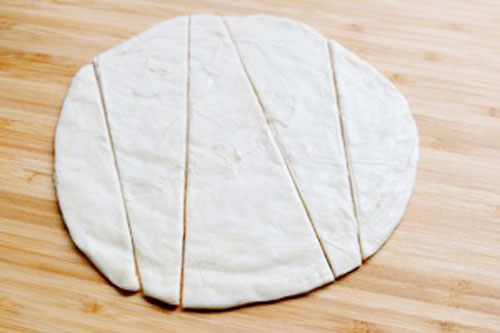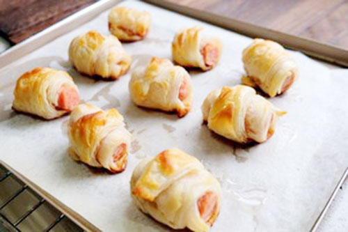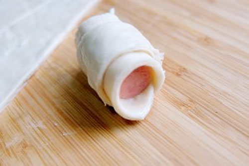 步驟三:火腿腸放至寬邊往尖頭卷,卷成可頌的樣子。