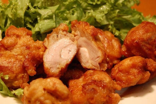 步驟八:鍋內(nèi)油大火燒熱,下雞塊再炸一次,炸的顏色變深之后撈出吸油即可。
