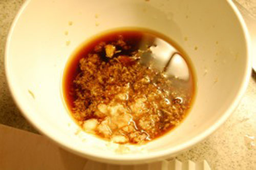 步驟一:將水、醬油、料酒、鹽、糖放入碗中,姜,蒜磨成末放入拌勻,做成醬汁備用。