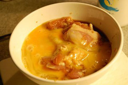 步驟四:取出腌制好的雞塊放入碗中,將一個雞蛋打勻后加入放雞塊的碗中拌勻。