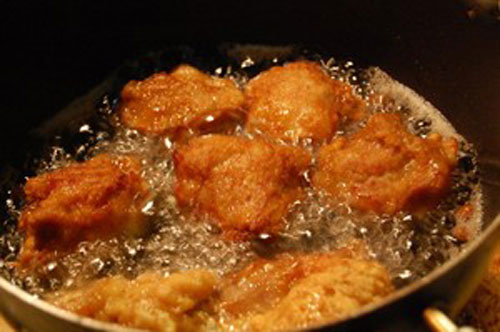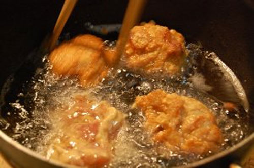 步驟六:油鍋放入足量的油,加熱至6成熱之后下雞塊進去炸,保持中火油炸。