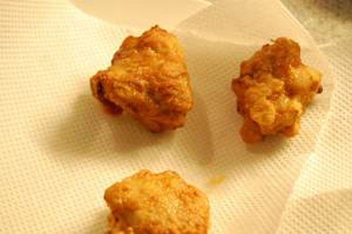 步驟七:全部雞塊炸的兩面金黃色之后撈在廚房紙上吸油待用。