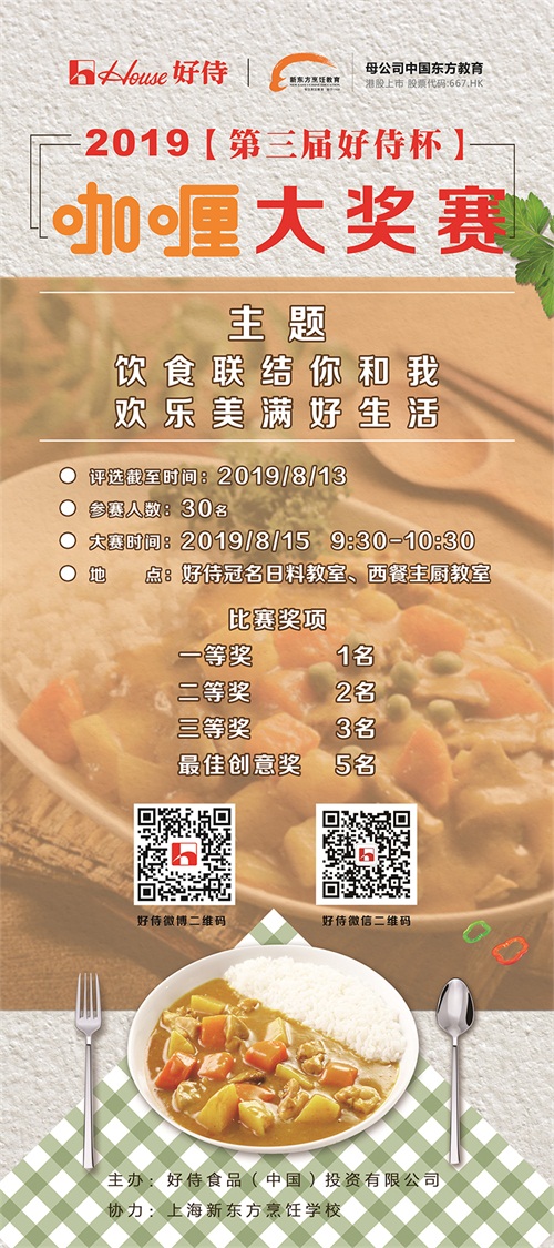 2019年8月13日-15日,上海新東方第三屆好侍咖喱大獎賽將于上海新東方烹飪學(xué)校正式開賽,與此同時,上海新東方日料教室揭牌儀式也將正式啟動。