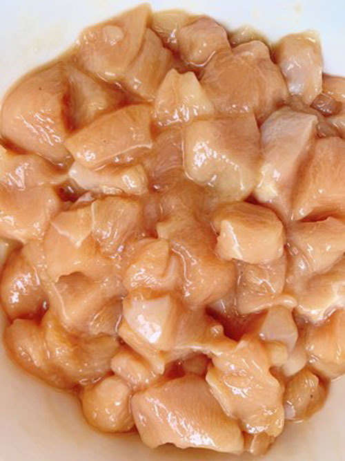 步驟一:雞肉洗凈,切成小塊,用生抽、料酒、鹽、糖腌制15分鐘以上。