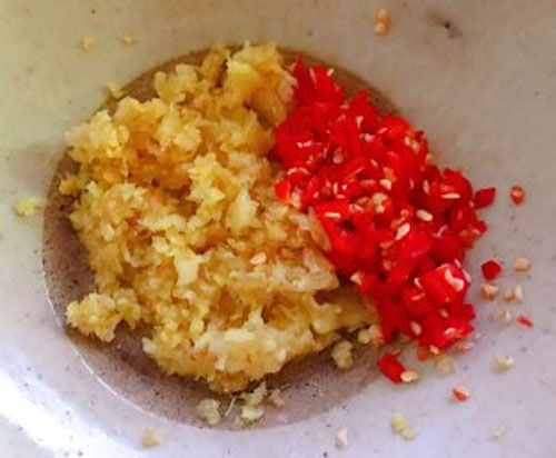 步驟三:大蒜和剩下的那塊老姜用搗蒜工具搗成泥,小米辣剁碎。