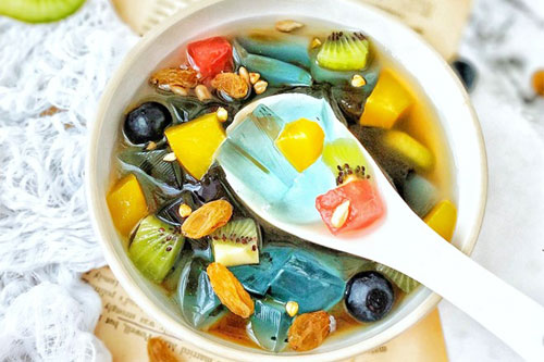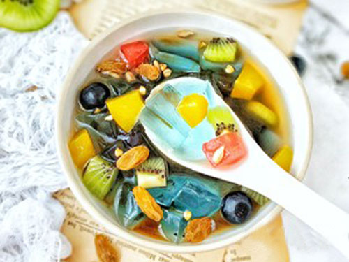 步驟三:取適量紅色涼粉切小塊,藍(lán)色涼粉切小塊,倒入適量紅糖水,放入水果,堅(jiān)果,葡萄干即可。