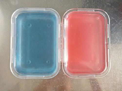 步驟一:鮮桃取皮,煮沸,取煮沸的汁沖泡白涼粉,攪拌均勻,放涼凝固,蝶豆花用開水泡開,取汁煮沸沖泡白涼粉,攪拌均勻,放涼凝固,備用。