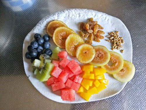 步驟二:準(zhǔn)備好藍(lán)莓、無花果、獼猴桃、西瓜、黃桃、葡萄干、堅(jiān)果、瓜子仁和紅糖水。
