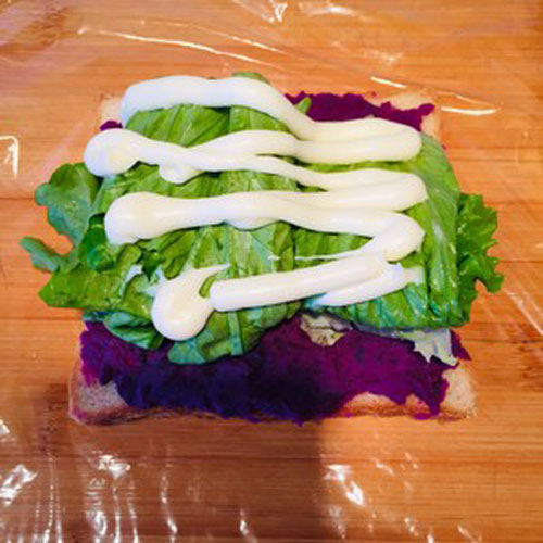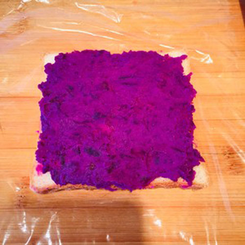 步驟二:將紫薯泥均勻地涂抹在吐司片上。