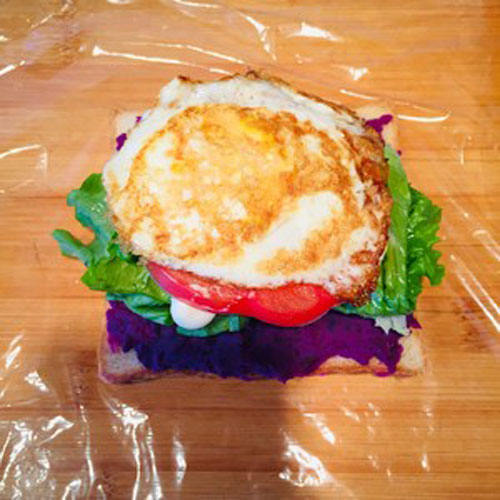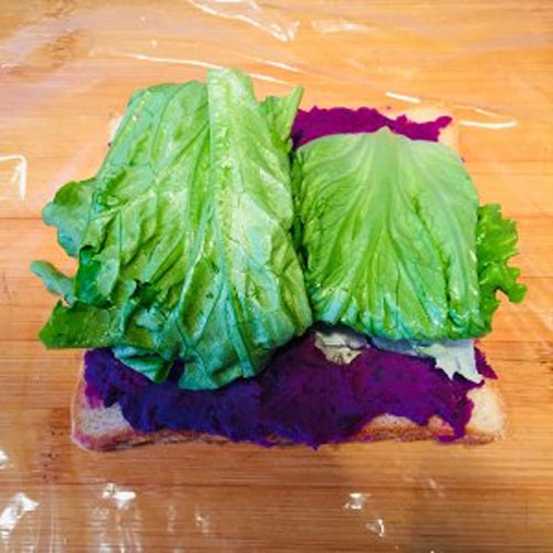 步驟八:放上另一片吐司,用保鮮膜緊緊裹起來,用刀從中間切開即可。