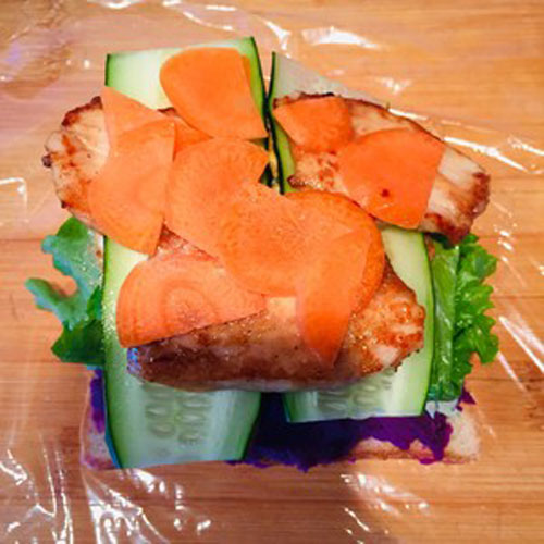步驟七:放黃瓜兩片,放腌好、煎熟的雞胸肉,放胡蘿卜或者玉米粒或者其他高顏值的喜愛的蔬菜。