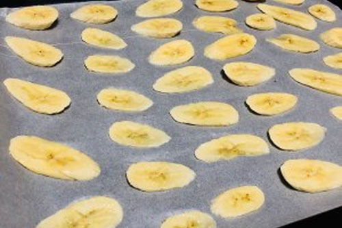步驟二:烤盤(pán)放無(wú)油紙,香蕉平鋪。