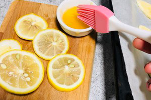 步驟三:在檸檬片上刷上蜂蜜,將檸檬汁擠在上面,然后將白糖撒在香蕉上。