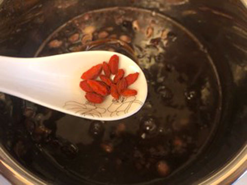 步驟三:煮至跳起后加入紅棗和泡好的蓮子,再把開關(guān)按下去,最后加入冰糖,加人枸杞,煮到糖化即可。