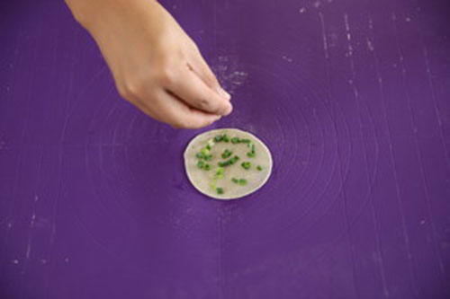 步驟一:香蔥洗凈、晾干、切粒,取一塊餃子皮,刷上植物油,撒一層薄薄的細鹽,撒上黑胡椒粉,均勻撒上蔥花。