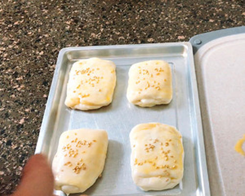 步驟三:油皮分成等分的劑子約30-40g,油酥15-20g劑子,油皮搟成圓形包入油酥,包好后面皮搟開成牛舌或者圓形并沿著邊緣卷起來,再次搟開成牛舌形,沿著邊緣再次卷起來,將成型的面皮搟開,表面刷全蛋液+白芝麻,放入烤盤烤箱預(yù)熱200度烤18-20分鐘即可。