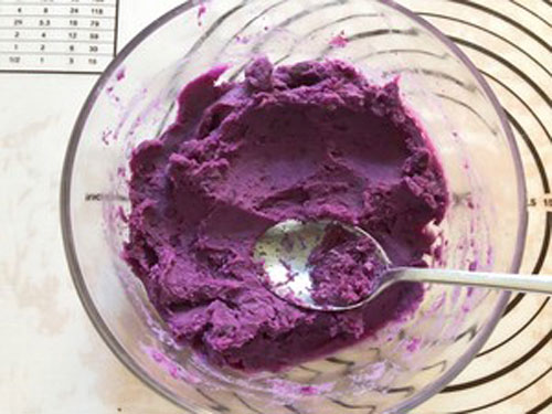 步驟二:紫薯切片放入蒸鍋中蒸軟蒸熟,用勺子壓成泥,放入煉乳和牛奶混合拌勻。