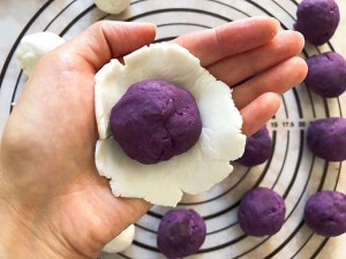 步驟三:餅皮分成25克一個(gè),紫薯分成25克一個(gè),包起來(lái),揉圓。