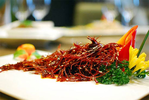 燈影牛肉的歷史已經(jīng)有100多年,作為一種風(fēng)味食品,深受吃貨們的喜歡。燈影牛肉是把牛后腿腱子肉切片后,經(jīng)腌、晾、烘、蒸、炸、炒等工序制作而成。其味道麻辣香甜,肉片薄而寬、可以透過(guò)燈影、有民間皮影戲之效果而得名,是達(dá)縣的傳統(tǒng)名食。