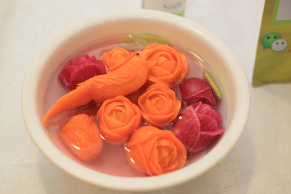 我校學(xué)生活動現(xiàn)場精心雕制的胡蘿卜玫瑰和喜鵲