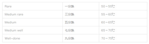 當(dāng)溫度升至60~65℃時(shí),結(jié)締組織強(qiáng)烈的收縮伴隨著大量的汁水溢出,牛排體積縮小質(zhì)地變硬,此時(shí)的牛排接近五成熟。如果繼續(xù)加熱,牛排很快會(huì)達(dá)到七成熟。