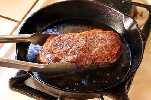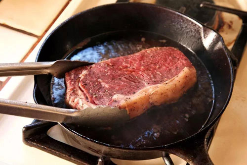 鍋要熱到什么程度呢,大致需要達(dá)到油的煙點(diǎn),也就是讓鍋底的油開(kāi)始升煙,可以說(shuō),充分熱鍋是煎牛排最最重要的一步。