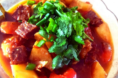 5、煮開(kāi),蓋上蓋子,小火慢燉1個(gè)半小時(shí)左右,牛肉燉的差不多了 放土豆塊,繼續(xù)燉,土豆燉一會(huì) 再放剩下三分之一的番茄,繼續(xù)燉。